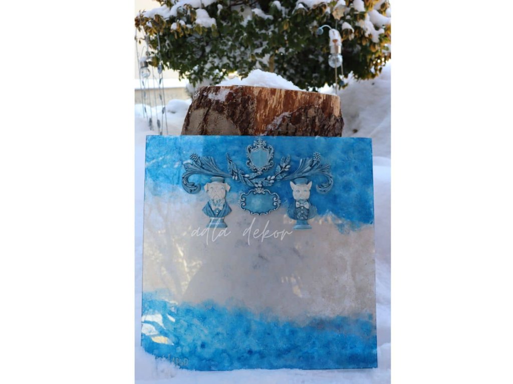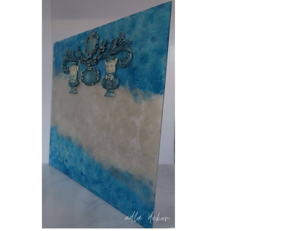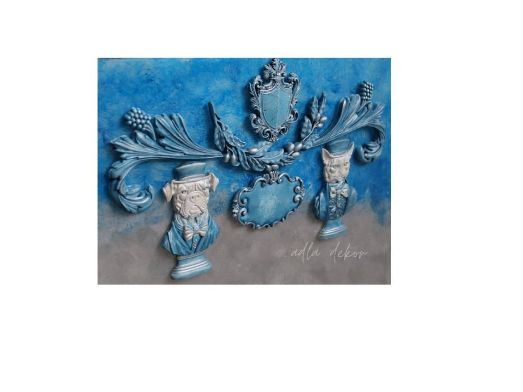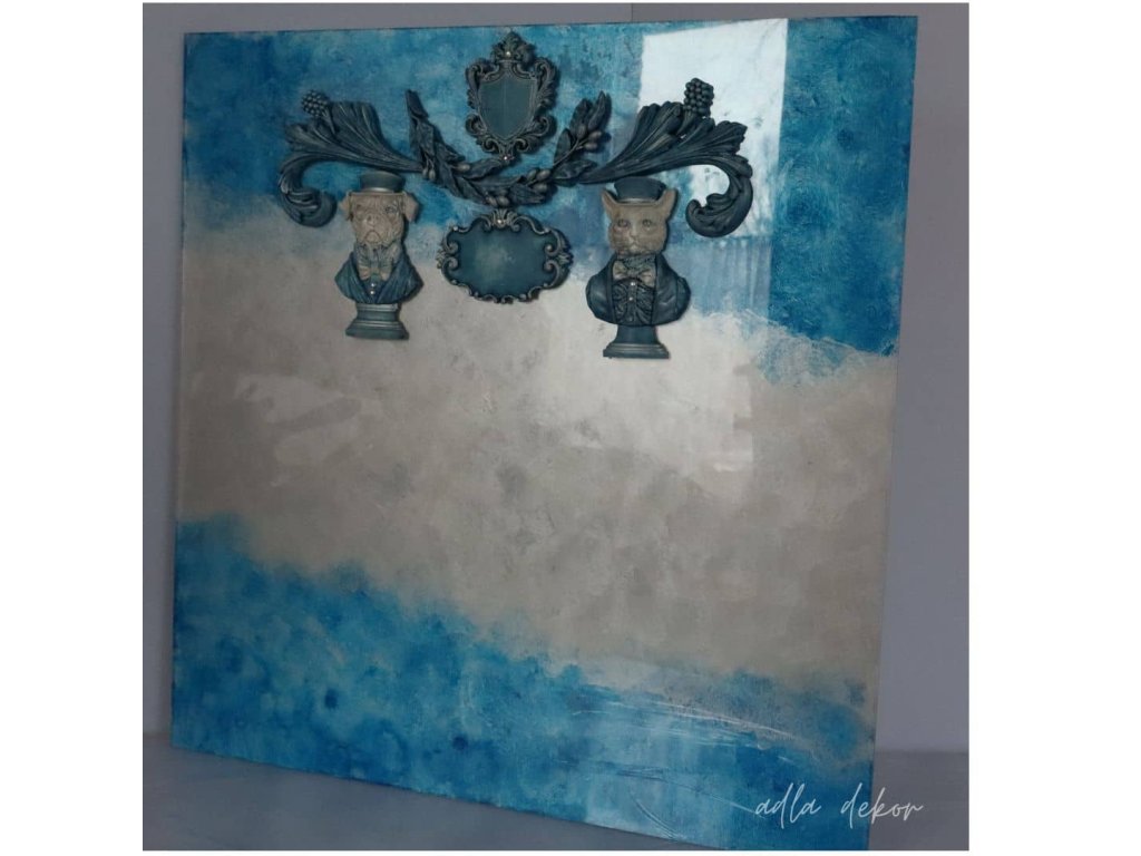 Do této barevné hloubky jsou vsazeny autorské keramické odlitky, vytvořené ve vlastních formách a ručně barvené v dokonalé harmonii s podkladem. Pejsek a kocour v klobouku přinášejí jemný úsměv a hravost, zatímco větvička olivy, ornamenty s erbem a prostor pro vizitku dodávají tabuli slavnostní a reprezentativní výraz.