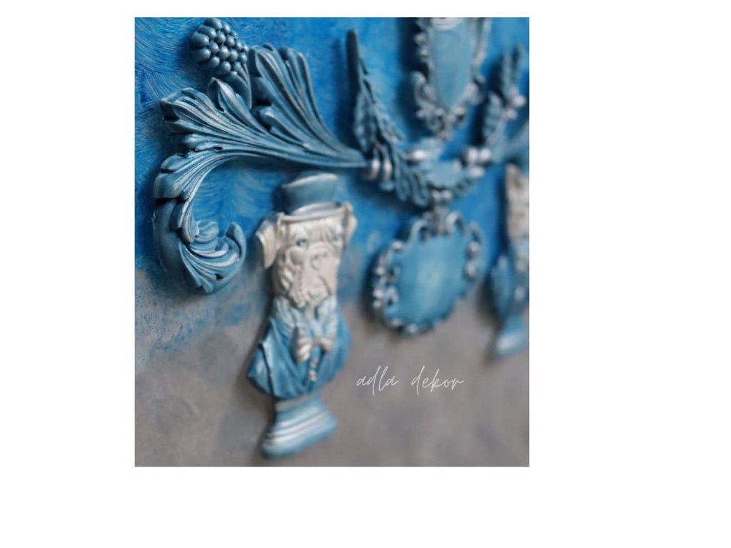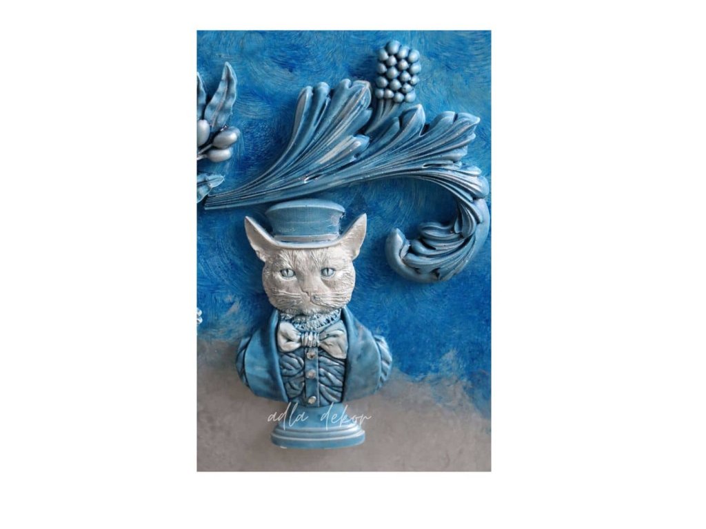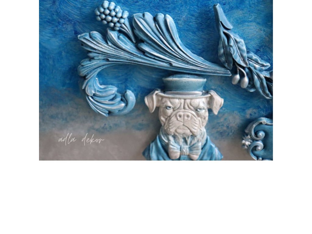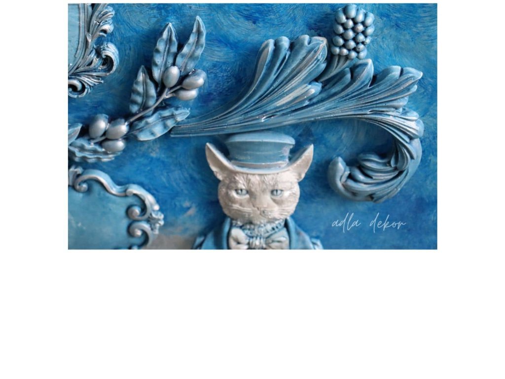 Do této barevné hloubky jsou vsazeny autorské keramické odlitky, vytvořené ve vlastních formách a ručně barvené v dokonalé harmonii s podkladem. Pejsek a kocour v klobouku přinášejí jemný úsměv a hravost, zatímco větvička olivy, ornamenty s erbem a prostor pro vizitku dodávají tabuli slavnostní a reprezentativní výraz.